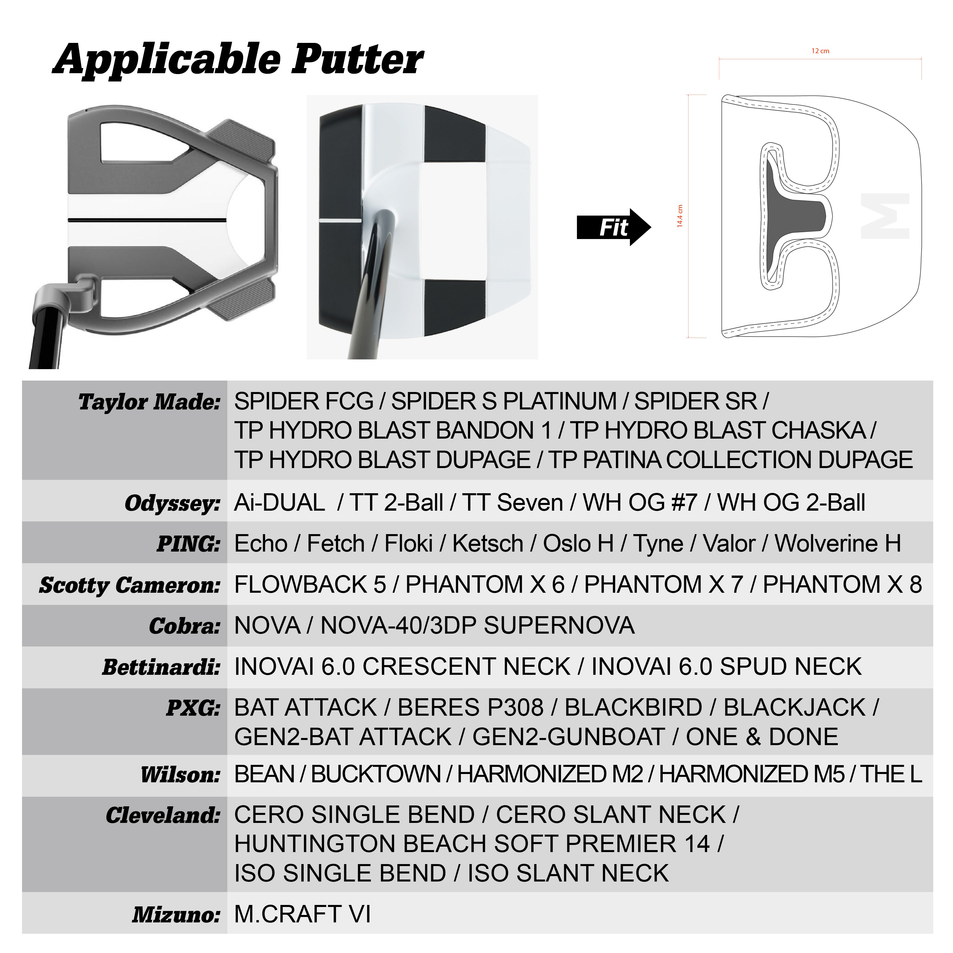 Our All-Shape Putter Head Covers are designed to fit most golf putters, whether heel shaft or center shaft. There are four sizes: XS, S, M, L to suit different putter shapes and lengths.